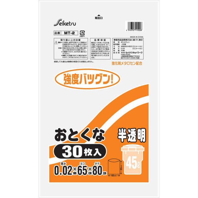基本情報 品番 MT-2 色 半透明 材質 LDPE+メタロセン サイズ 厚み0.02×ヨコ650×タテ800mm 入数 30枚入×30冊 JANコード 4976797115028 メーカー セイケツネットワーク